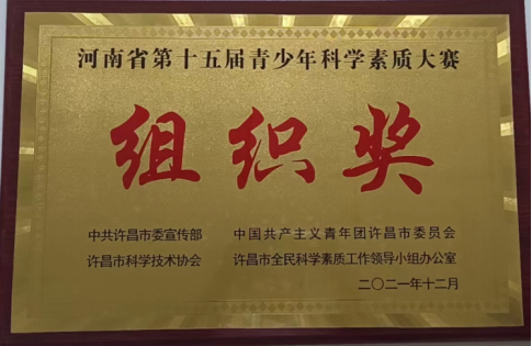 近日,我院喜获中共河南省委宣传部、中国共产主义青年团河南省委员会、河南省全民科学素质工作领导小组办公室、河南省科学技术协会联合授予的"河南省第十五届青少年科学素质大赛"优秀组织奖和中共许昌市委宣传部、中国共产主义青年团许昌市委员会、许昌市全民科学素质工作领导小组办公室、许昌市科学技术协会联合授予的"河南省第十五届青少年科学素质大赛"组织奖。