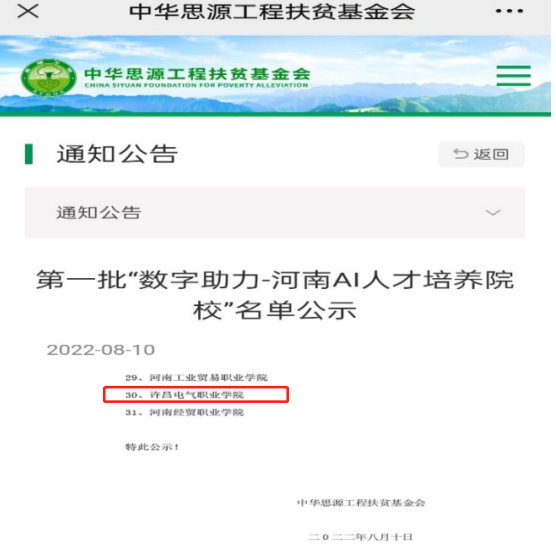 今年6月,副院长冯朝印获悉“数字助力—河南AI人才培养”项目后,立即动员指导信息工程系进行申报。信息工程系迅速行动,陈晓红、郭赟召集任晓鸽、王旭、任甜甜等组成专班根据申报条件结合学院和系部实际,认真撰写申报材料。7月22日,赶在第一批申报截止之前向中华思源工程扶贫基金会提交申报材料,并通过了评审。8月10日,我院作为第一批获批的31所“数字助力-河南AI人才培养院校”在中华思源工程扶贫基金会官网进行了公示。