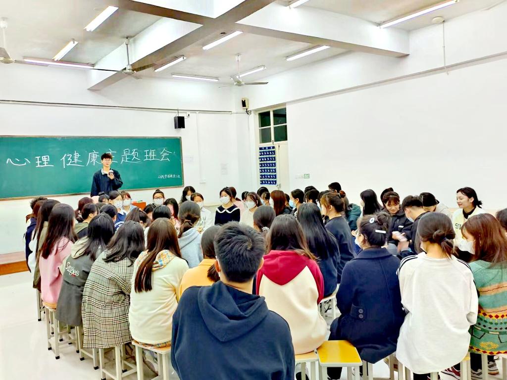 10月29日,开展心理健康主题班会,通过互动游戏增加同学之间的感情,减轻焦虑,形成互助、轻松的班级氛围。