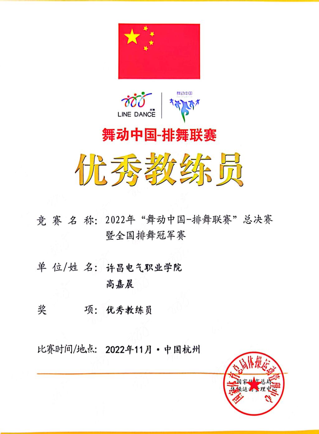 2022年12月17日-18日,在2022年“全民健身舞起来、我的时代正精彩”全国排舞社区运动会校园部(河南站)网络大赛中,我院由42名学生组成的代表队获得高校组校园课间操项目特等奖,我院获“优秀组织奖”荣誉称号,高嘉晨、张世浩获“优秀教练员”荣誉称号。