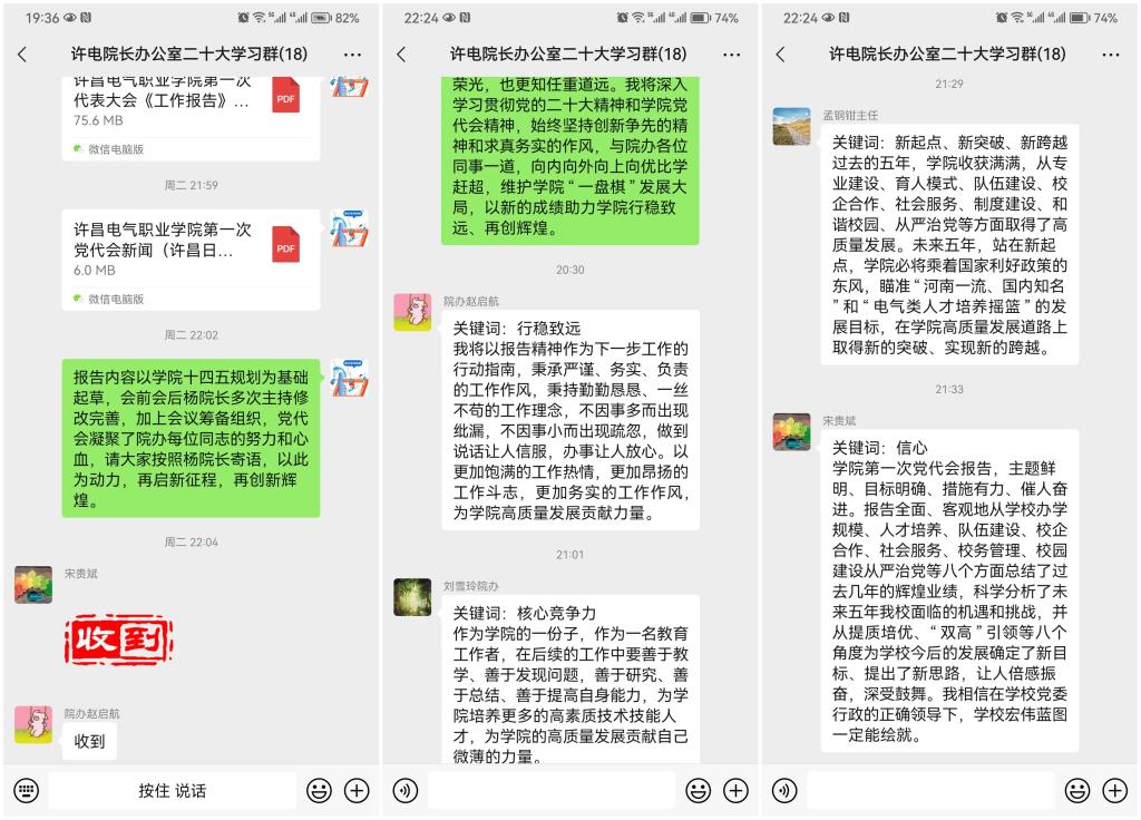 师生们纷纷表示,要把学习宣传贯彻好第一次党代会精神作为当前和今后一段时期学院的一项重大政治任务时,注重加强与学习贯彻党的二十大精神相结合、与学习贯彻习近平总书记关于职业教育的重要论述相结合,高质量推动党代会目标任务落实落地、取得实效,奋力谱写新时代许电院发展新篇章。