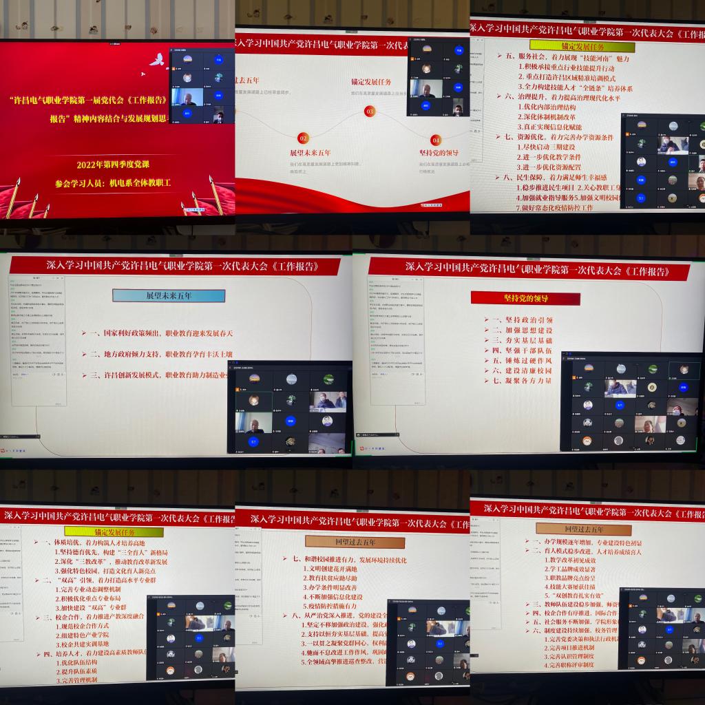 12月2日至3日,中国共产党许昌电气职业学院第一次代表大会胜利召开,大会全面回顾总结了学院过去五年取得的丰硕成果,瞻望了职业教育的大好形势和美好前景,高屋建瓴地谋划了今后五年学院发展的总体要求、总体目标,对今后五年学院高质量发展的十大工程、八项重要任务、七个坚持进行了全面部署。学院第一次党代会闭幕以来,院属各单位按照学院部署安排,掀起了深入学习贯彻第一次党代会精神的热潮。
