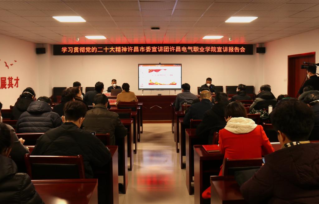 1月13日下午,学习贯彻党的二十大精神市委宣讲团成员、许昌市科技局党组成员、副局长何伟到我院开展专题宣讲。院党委书记彭占亭,院党委副书记张明慧,工会主席张贵军,副院长朱东煜出席宣讲会,县级以上领导干部、全体思政教师参加会议。党委委员、宣传部长张国栋主持会议。