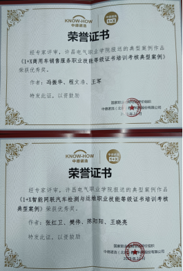 日前, 许昌电气职业学院在全国1+X第三批智能网联汽车检测与运维和商用车销售服务职业技能等级证书考核站点评定中获评“卓越试点单位”,陈阳阳、程文浩等老师的两个等级证书教学案例分别被评为“优秀奖”,我院王桂琴等老师分别获“卓越贡献奖”、“考核组专家”等荣誉称号。