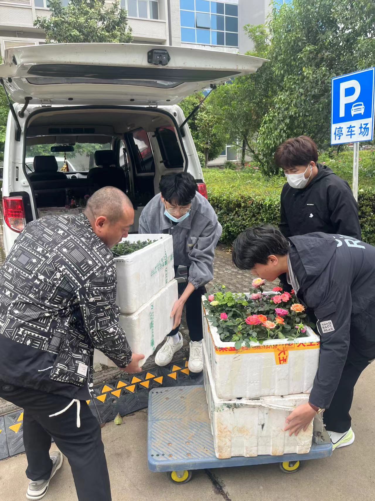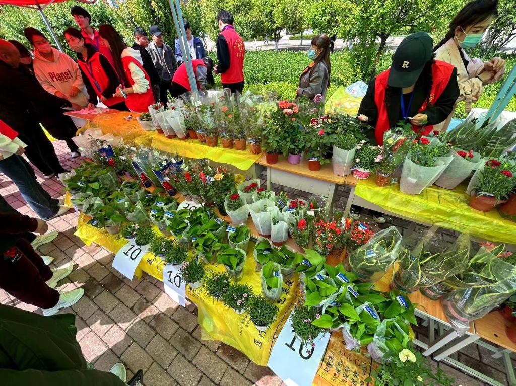 活动一开始,现场便排起了长队。同学们用麻袋、塑料袋、纸箱装满了收集来的塑料瓶,等候兑换。大家挑选着心仪的绿植,志愿者耐心组织登记。