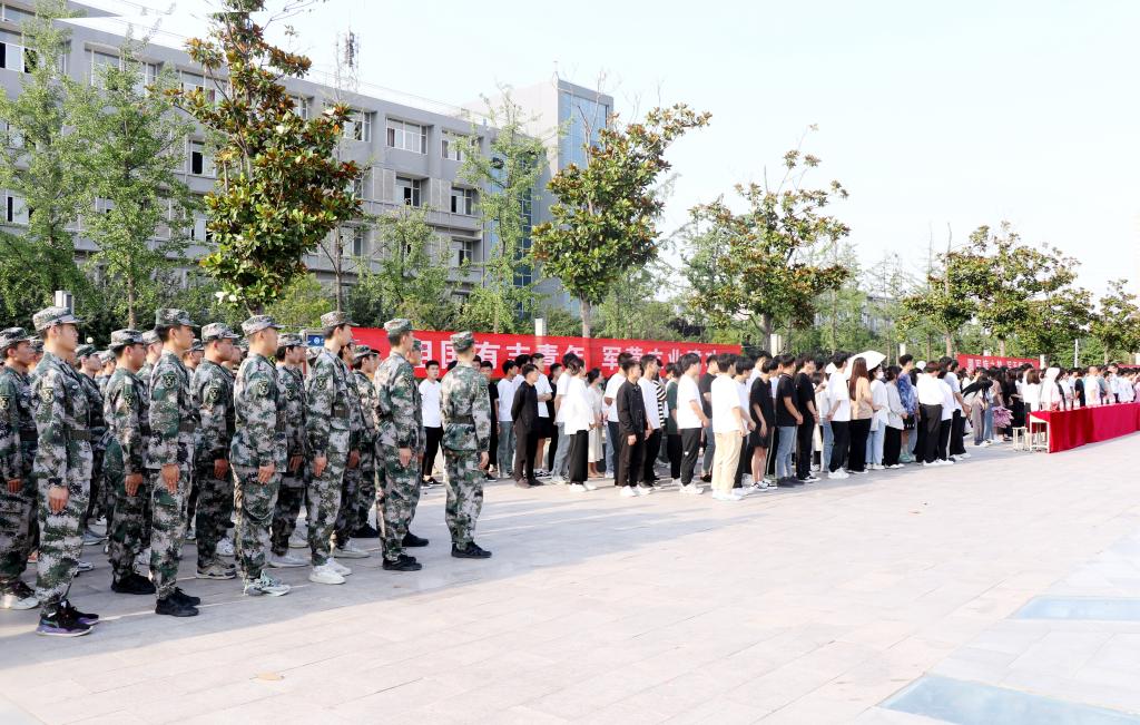 活动现场,人头攒动,激情似火。盛夏的烈日伴随着青春的旋律,条副、标语、版面、入伍打卡点、征兵报名咨询处扮靓了本就多姿多彩的校园,由预征预储对象组成的迷彩方队成为了亮点,橄榄绿今天成了学校的主旋律,携笔从戎成为莘莘学子的梦想。
