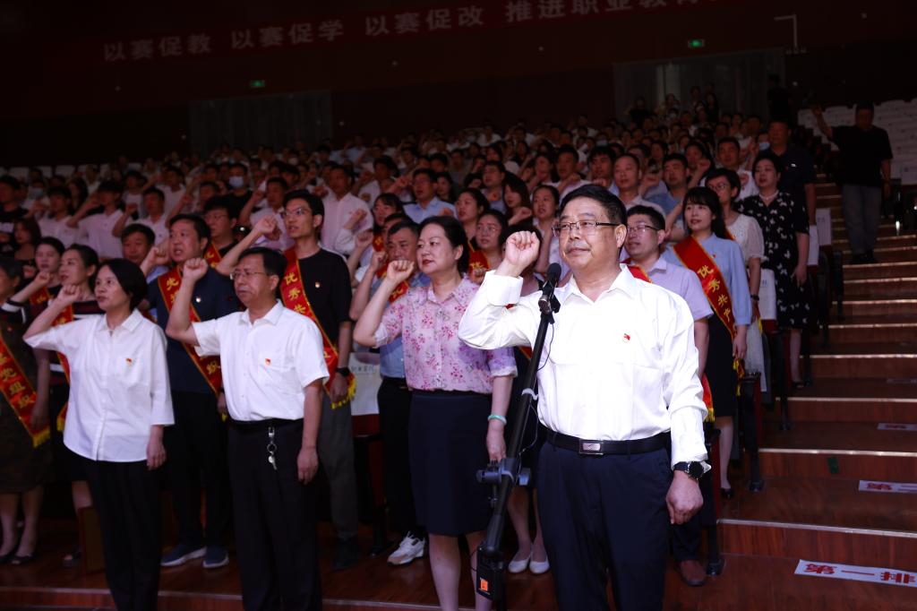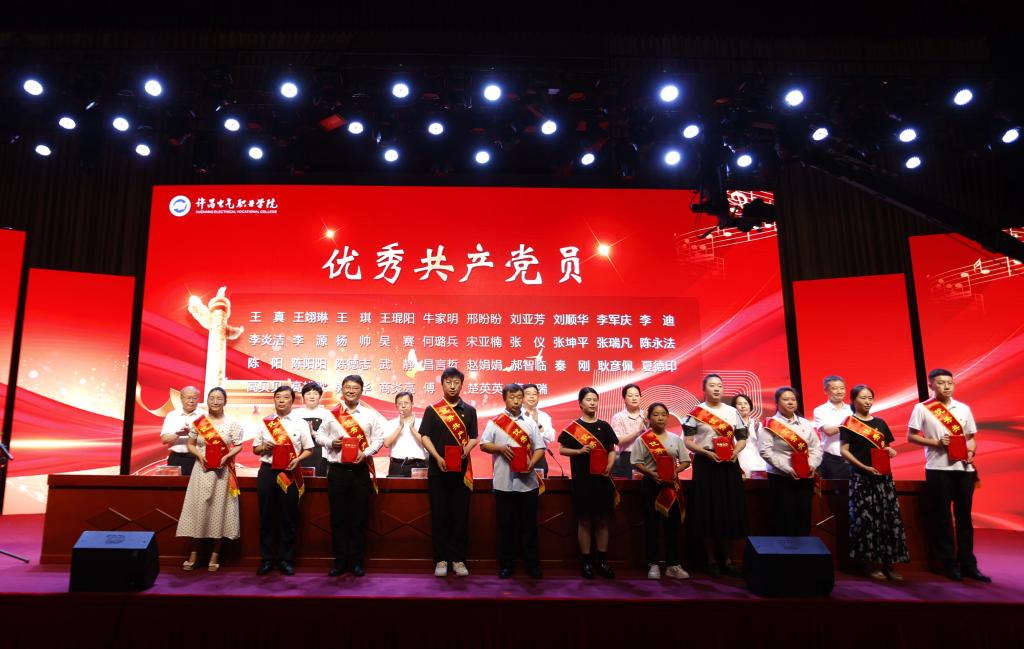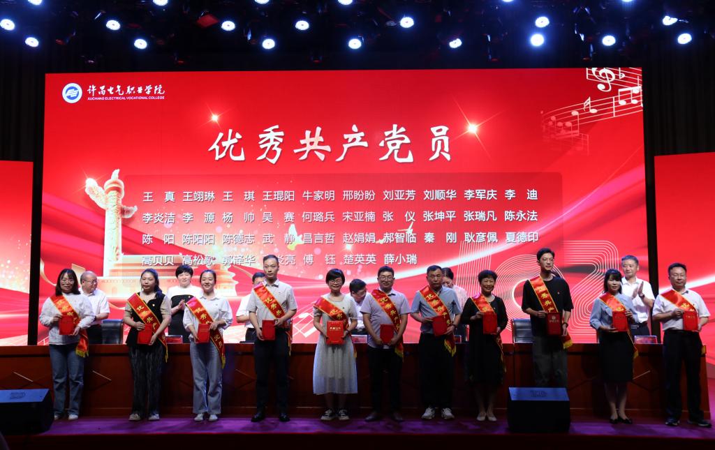 大会在庄严的国歌声中拉开序幕,首先,党委委员、工会主席张贵军宣读《中共许昌电气职业学院委员会关于表彰2023年先进基层党组织、优秀党务工作者和优秀共产党员的决定》,对组织部联合党支部等7个先进基层党组织,卜伟松等15名优秀党务工作者,王真等37名优秀共产党员进行表彰。党委委员依次为先进集体和优秀个人颁发荣誉奖牌和荣誉证书。接着,举行新党员入党宣誓仪式及全体党员同志重温入党誓词仪式。学院党委书记彭占亭领誓,与会全体党员起立,面向党旗,高举右拳庄严宣誓,重忆入党初心,表达对党绝对忠诚和为事业奋斗终身的决心。