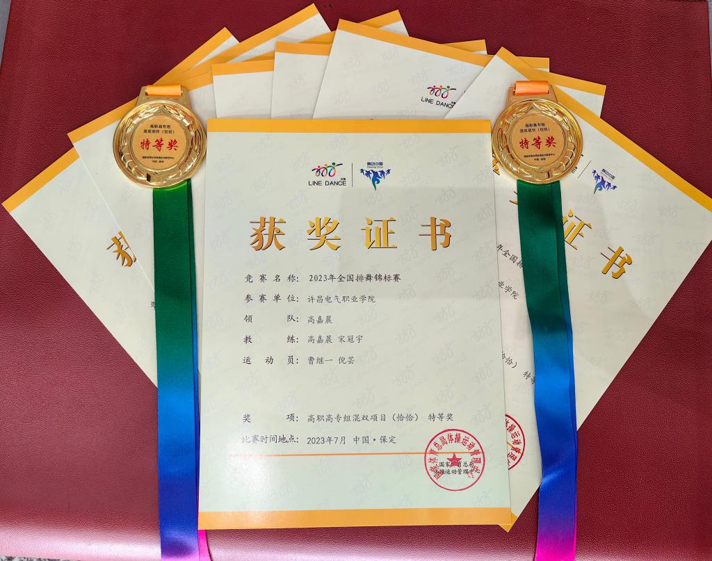 我校积极派出代表队参加此次比赛,奔赴赛场前,高嘉晨、宋冠宇老师带领学生克服困难于暑期期间在校集中训练,电气工程系学生曹继一、艺术系学生倪芸经过激烈角逐,最终获得2023年全国排舞锦标赛混双组特等奖第一名的优异成绩。高嘉晨、宋冠宇老师获“优秀教练员”荣誉称号。
