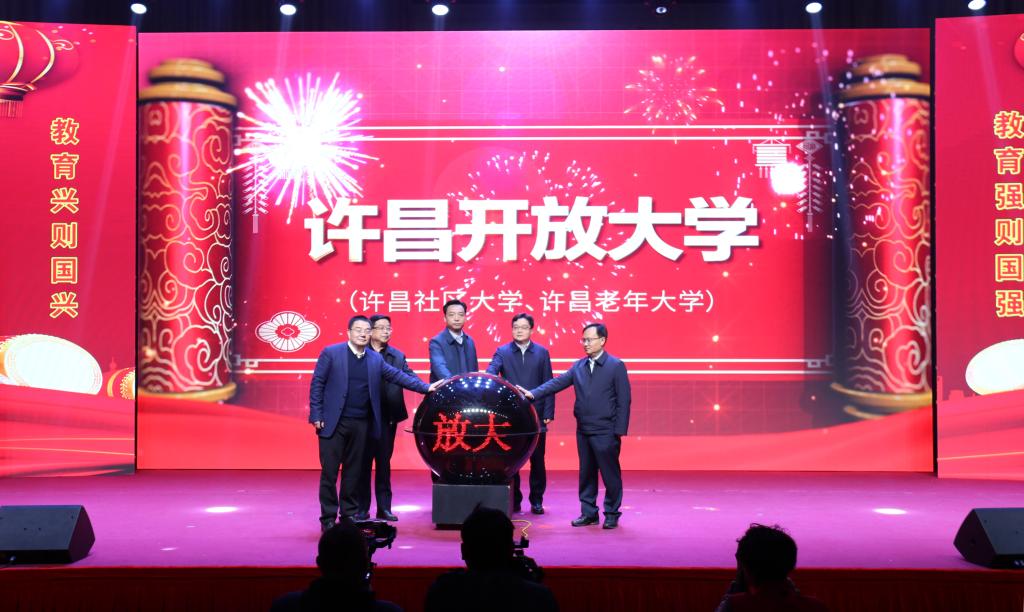 河南开放大学校长孙斌、许昌市人民政府副市长赵鹏、许昌电气职业学院党委书记彭占亭、许昌市人民政府办公室副主任李孝、许昌市委教育工委副书记、许昌市教育局局长刘庆,共同为许昌开放大学揭牌