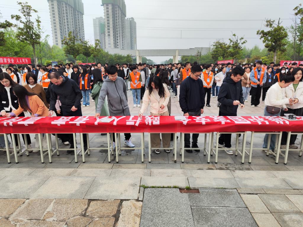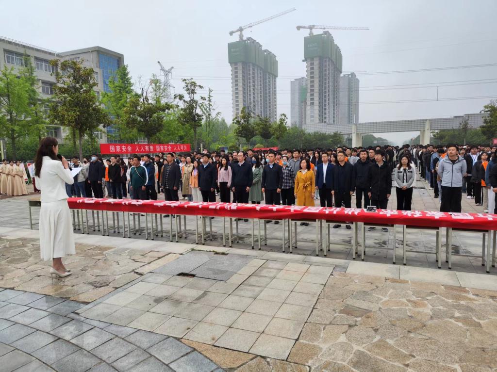 为进一步增强全院师生的国家安全意识,牢固树立和践行总体国家安全观,在第九个“全民国家安全教育日”来临之际,我院围绕“总体国家安全观·创新引领10周年”主题,4月15日7:00时,在喷泉广场举行“国家安全,人人有责,从我做起”师生签名仪式,副院长贾楠,党委委员、宣传部部长张国栋,学生处长杨红培,保卫处长杨绍业及信息系领导、全体师生参加活动。