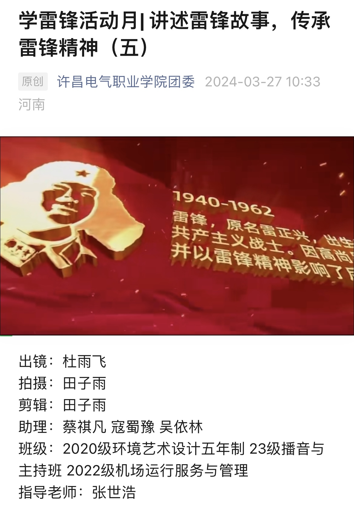 三月微雨滋润,雷锋精神永传。许电学子积极响应号召,从小事做起,从点滴做起,努力将雷锋精神传递到每个角落,让学雷锋活动融入日常、化作经常,让雷锋精神在新时代绽放更加璀璨的光芒。