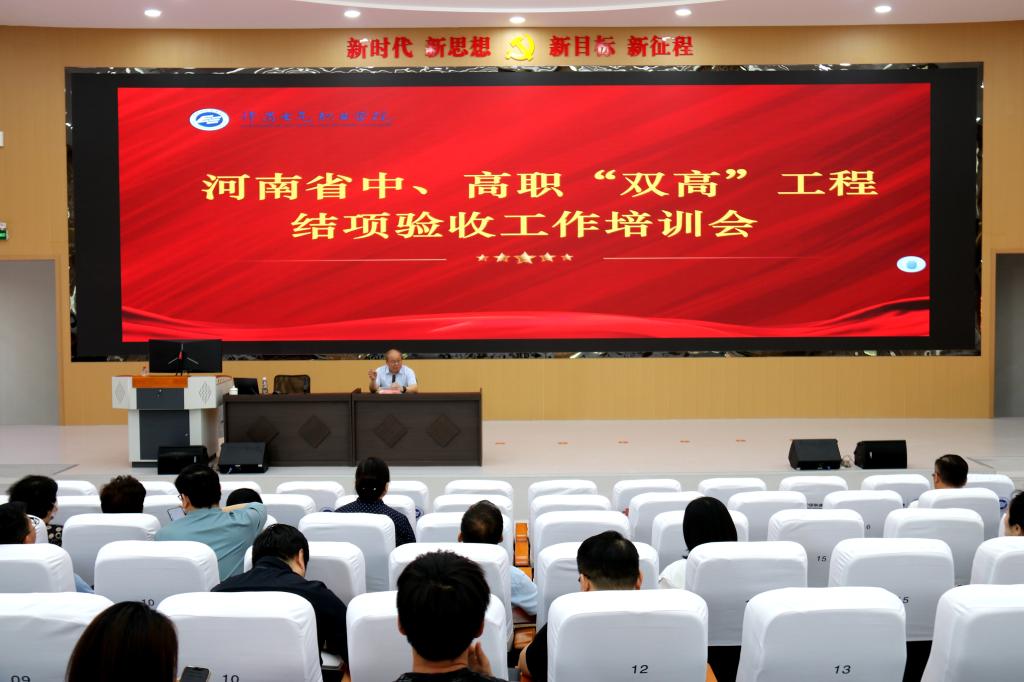 为进一步学习“双高”工程建设理论和经验,加强学院“双高”建设,深入开展学院中、高职“双高”工程结项验收工作,5月8日下午,我院特邀许昌职业技术学院双高建设办公室主任李志红和机电与汽车工程学院副院长楚宜民来校作“双高”工程验收专题培训。学院副科级以上干部、验收工作专班成员、各专业教学团队负责人及“机电设备安转与维修”高水平专业群和“电气自动化技术”高水平专业群各专业带头人参加培训。会议由副院长张俊才主持。