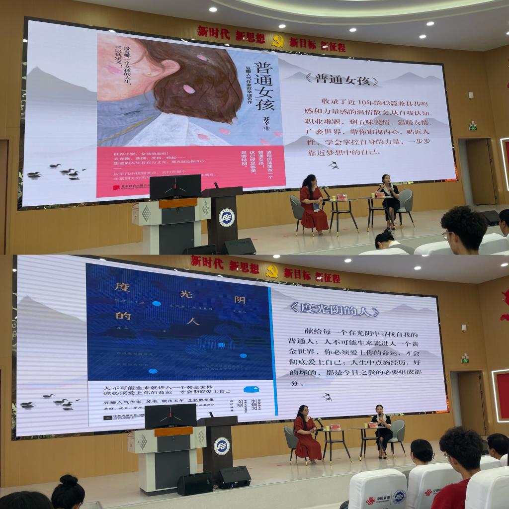 活动现场,青年作家苏辛用自己的成长故事讲述了读书的意义。对谈环节,现场交流互动积极踊跃。苏老师提到,是她对读书的热爱打开了她的新世界,成就了更好的自己,创造了生命的无限可能。苏老师也勉励同学们,不要被当下的学历、身份所束缚。坚持阅读,坚持提升自己。那些读过的书,终将化为命运的方舟,载着我们冲破思维的禁锢,驶向未来的无限可能。苏老师用自己的学习工作经历告诉学生,充实地过好当下,同时要满怀期待、饱有热情地拥抱每一个崭新的明天。我们每个人在拥有工作生活中多重身份的同时,要提醒自身回归到人这一本质属性,尽努力去热爱生活,热爱生命,创造可能,让人生绽放。