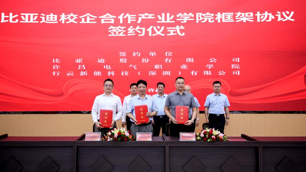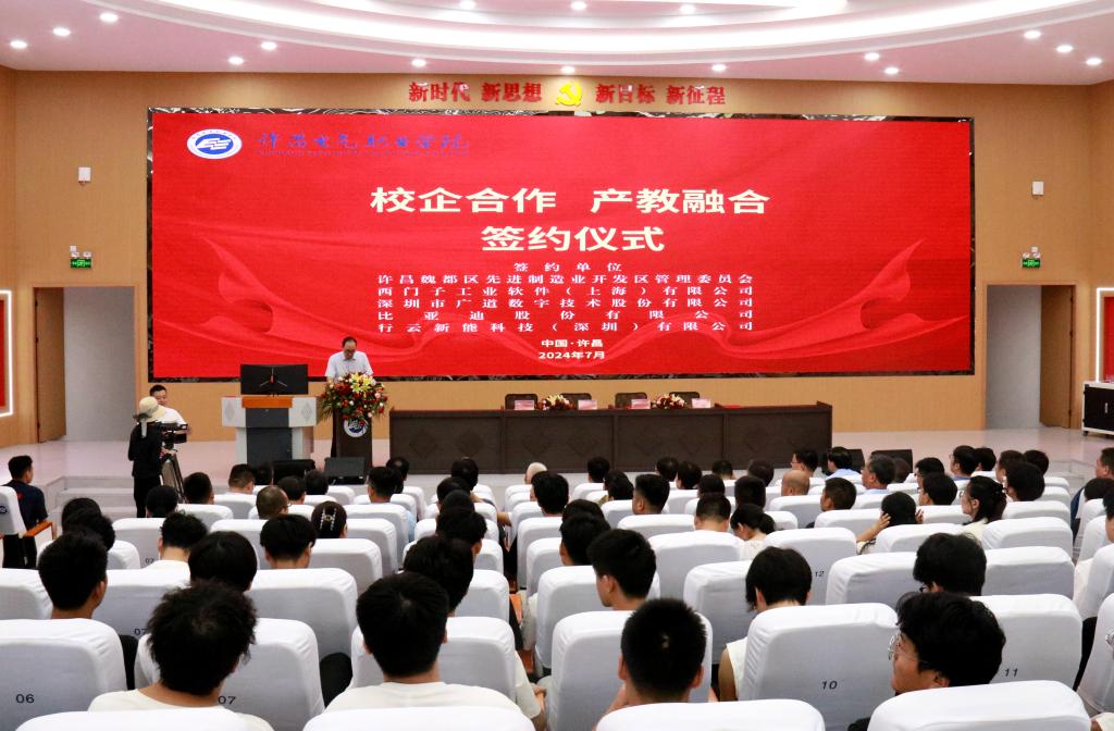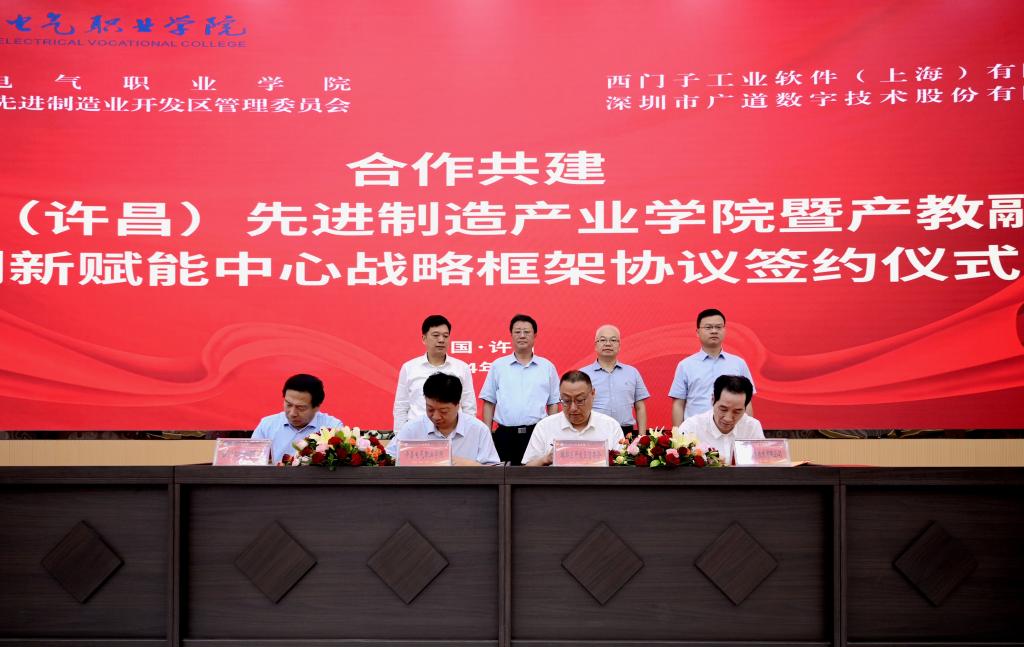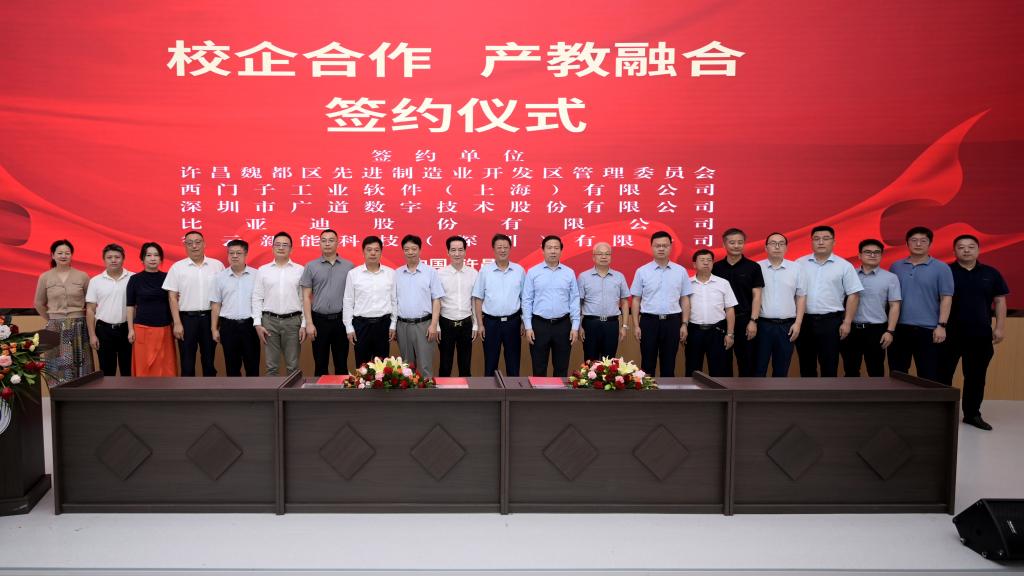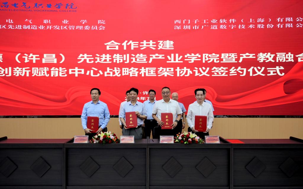 仪式上,许昌电气职业学院、魏都区先进制造业开发区、西门子工业软件(上海)有限公司、深圳市广道数字技术股份有限公司签署合作共建“中德(许昌)先进制造产业学院暨产教融合创新赋能中心”战略框架协议;许昌电气职业学院、比亚迪股份有限公司、行云新能科技(深圳)有限公司签署共建“比亚迪校企合作产业学院”框架协议。
