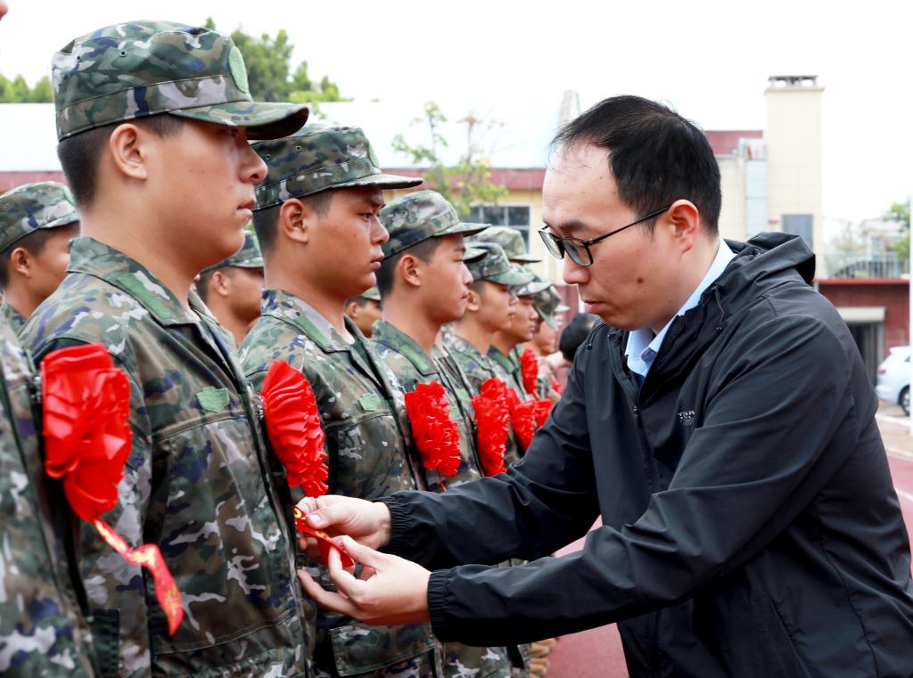 会后,欢送人员为入伍大学生佩戴大红花、发放纪念品并进行亲切交流、合影留念。