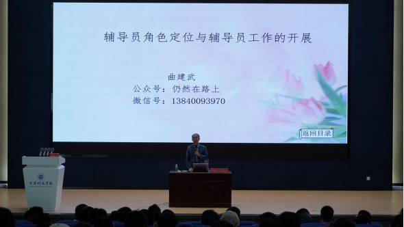 培训会上,曲建武教授以《辅导员角色定位与辅导员工作的开展》为题,结合自身40余年丰富的从教经历,从三个方面、八个角度,强调了爱党、爱生、爱教在落实立德树人根本任务中的思想引领作用。他以鲜活的事例、切身的体会进行了分享,两个小时的讲座,曲建武教授全程情绪饱满地站立演讲,身体力行地表达着“和学生在一起”的坚守,传播着对教育事业的热爱。