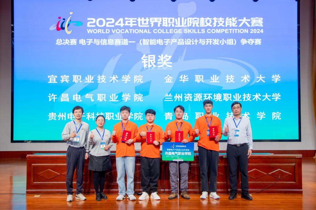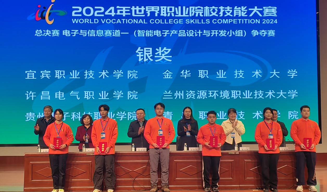 10月28-30日,2024年世界职业院校技能大赛总决赛争夺赛高职组电子与信息赛道——智能电子产品设计与开发小组争夺赛在烟台职业学院举行。来自全国30个省、市、自治区及新疆生产建设兵团61支队伍的233名选手参加了争夺赛。经过激烈角逐,由我校电气工程学院学生娄彦旭、毛登科、介含啸、张满组成的参赛队,在电子技术专家团队老师(指导老师:武静、肖菡)指导下荣获全国银奖,实现了我校职业技能大赛成绩的新突破,为我校申报新一轮“双高”校提供了有力支撑。