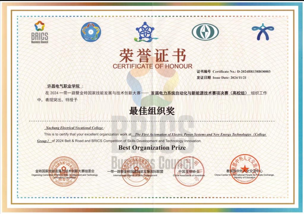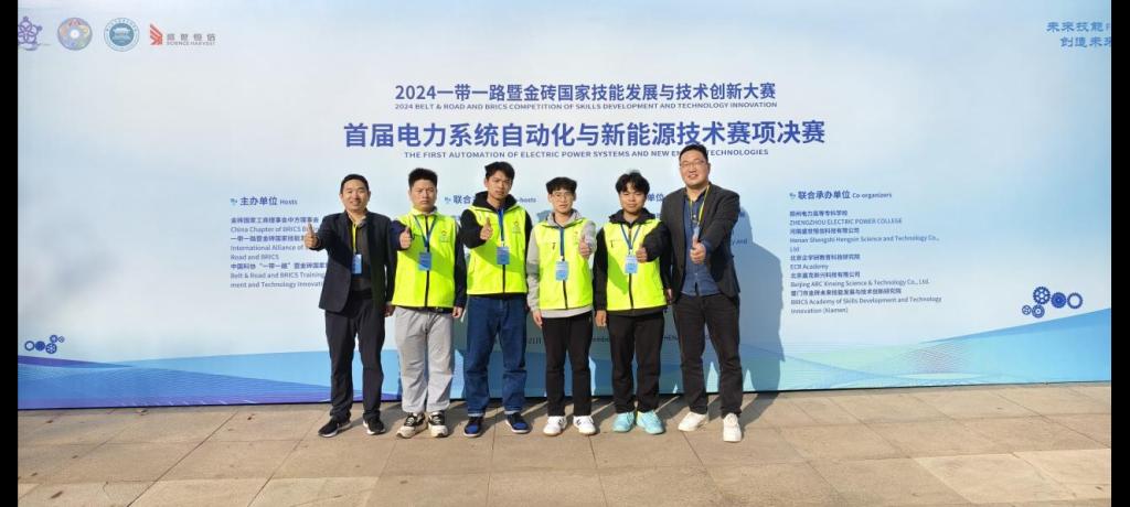 11月19日-11月21日,2024年一带一路暨金砖国家技能发展与技术创新大赛首届电力系统自动化与新能源技术赛项全国总决赛在郑州电力高等专科学校举行。大赛吸引力了全国70支高校队伍报名参赛,经过激烈角逐,我校电气工程学院学生祖庆豪、胡巍林(指导老师:邵淑敏、罗帅)荣获全国一等奖(金牌),电气工程学院学生曹福泉、何峰(指导老师:夏德印、郑栋梁)荣获全国三等奖(铜牌),同时学校获得最佳组织奖。