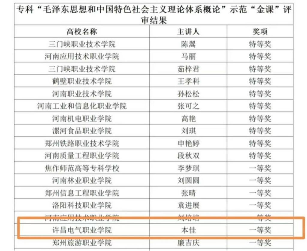 根据中共河南省委教育工委办公室、河南省教育厅办公室《关于开展高校思政课优秀课程资源评选工作的通知》(教思政函﹝2024﹞655号)要求,经各高校申报、资格审查、专家评审、综合评议等环节,一批优秀课程资源评审结果于近日公示。我院共三位老师申报示范“金课”,全部获奖。其中,本佳老师荣获专科“毛泽东思想和中国特色社会主义理论体系概论”示范“金课”一等奖,裴华华老师荣获专科“思想道德与法治”示范“金课”二等奖,马唱唱老师荣获专科“习近平新时代中国特色社会主义思想概论”示范“金课”二等奖。