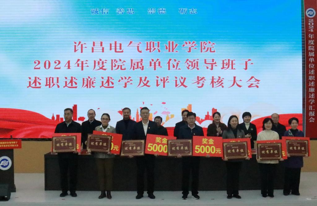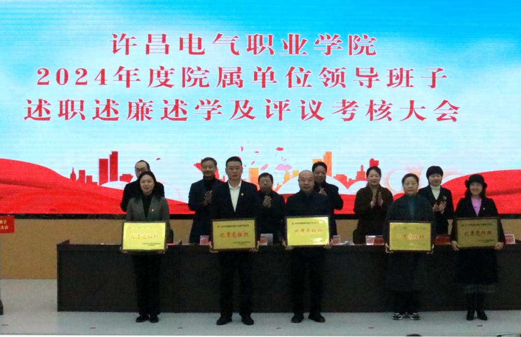 会上,工会主席张贵军宣读《中共许昌电气职业学院委员会关于2023年度基层党组织书记抓党建工作述职考核评议结果的通报》,副院长贾楠宣读《许昌电气职业学院关于表扬2023年度考核优秀单位的通报》。学院领导为上年度基层党建述职评议考核优秀党组织和考核优秀单位颁发奖牌。