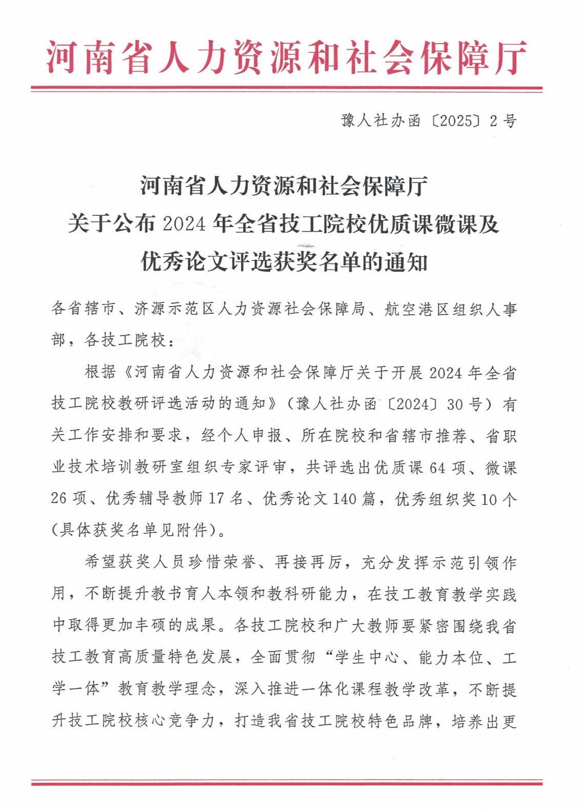 近日,省职业技术培训教研室组织的2024年全省技工院校教研评选结果公布,学院教师喜获佳绩,共获得一等奖1项、二等奖1项、三等奖1项,我院选派的3名教师全部获奖。其中,学院教师武静获微课一等奖,楚英英获优质课二等奖,罗帅获优质课三等奖。