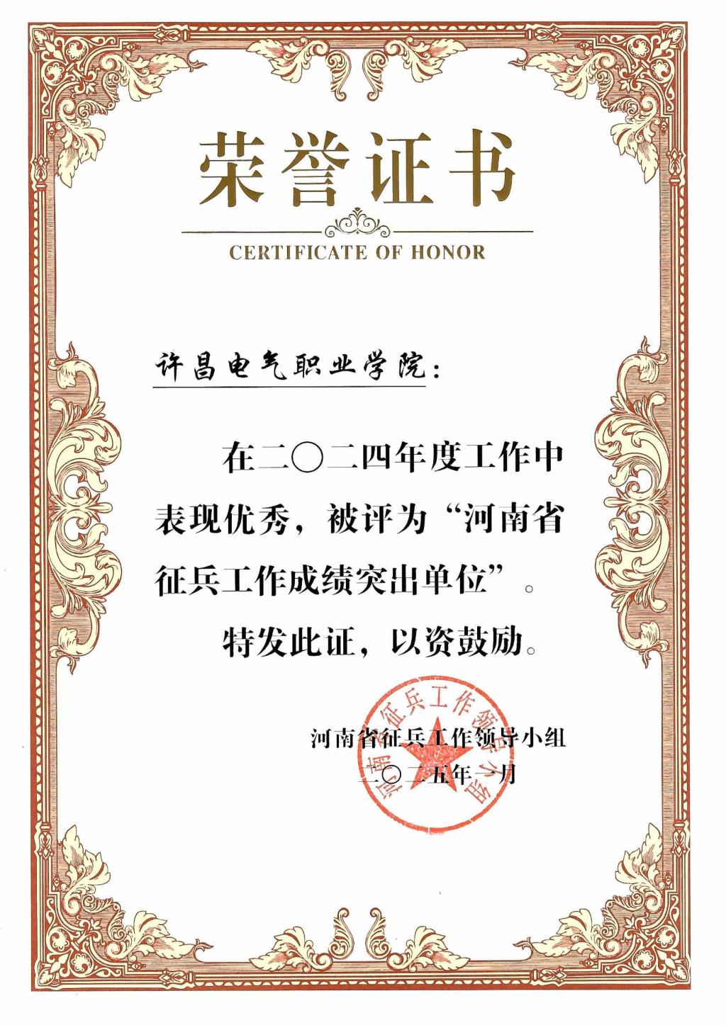 近日,河南省征兵领导小组下发《关于表扬2024年河南省征兵工作成绩突出单位和个人的通报》(豫征〔2025〕1号),我院荣获河南省“征兵工作成绩突出单位”,此次全省共有20所普通高等院校受到表彰。