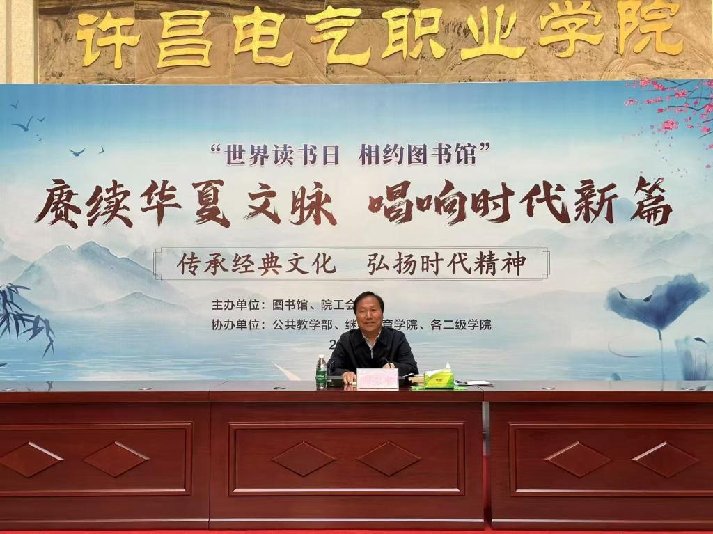 4月23日上午,许昌电气职业学院图书馆举办第十届读书节启动仪式。本届读书节以“赓续华夏文脉•唱响时代新篇”为主题,旨在弘扬中华优秀传统文化,推动校园阅读风尚,营造书香校园氛围。院工会主席张贵军、副院长贾楠出席仪式,院属相关单位负责人以及各系学生代表参加活动。