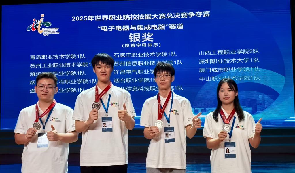 8月28-30日,2025年世界职业院校技能大赛高职组“电子电器与集成电路”赛道总决赛争夺赛在深圳信息职业技术大学举行。来自全国30个省、市、自治区及新疆生产建设兵团的154支队伍参加了争夺赛。经过激烈角逐,由我校电气工程学院学生介含啸、周坚强、王双成、张冯子钰组成的参赛队发挥出色,在电子技术团队老师(指导老师:陈建中、胡凯利)指导下荣获全国银奖。