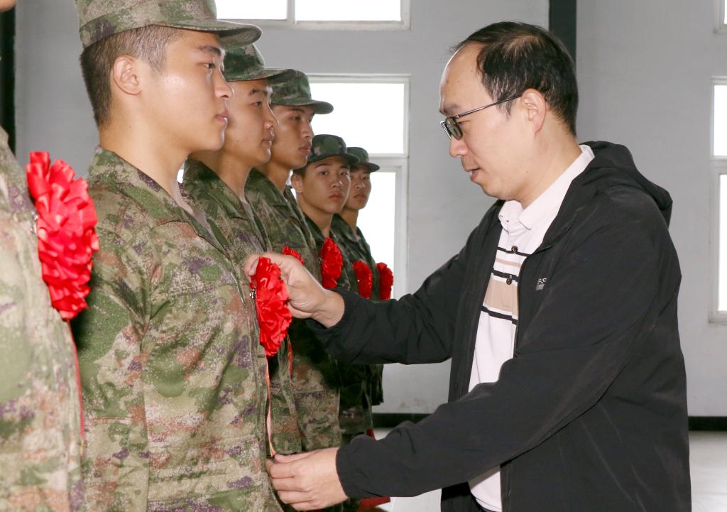 仪式结束后,欢送人员为入伍大学生佩戴大红花、发放纪念品并合影留念。
