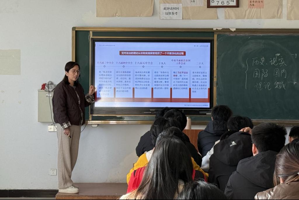 调研组采取随机抽取、“推门听课”的方式,深入课堂听取了我校马克思主义学院龚晓东、杨帅、陈曦三位教师的思政课。龚晓东老师围绕《思想道德与法治》中“追求远大理想,坚定崇高信念”主题,阐释了理想信念的内涵与时代价值。杨帅老师结合《习近平新时代中国特色社会主义思想概论》第九章相关内容,以习近平法治思想为核心,生动讲解了全面依法治国的重大意义与实践路径。陈曦老师在《形势与政策》课上,引导学生正确认识当前中国经济热点问题,深入浅出地分析了我国应对外部冲击的底气来源以及促进民营经济发展壮大的必要性。