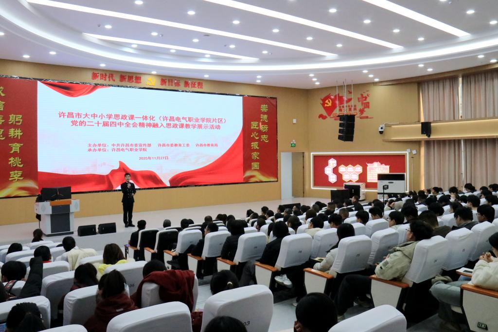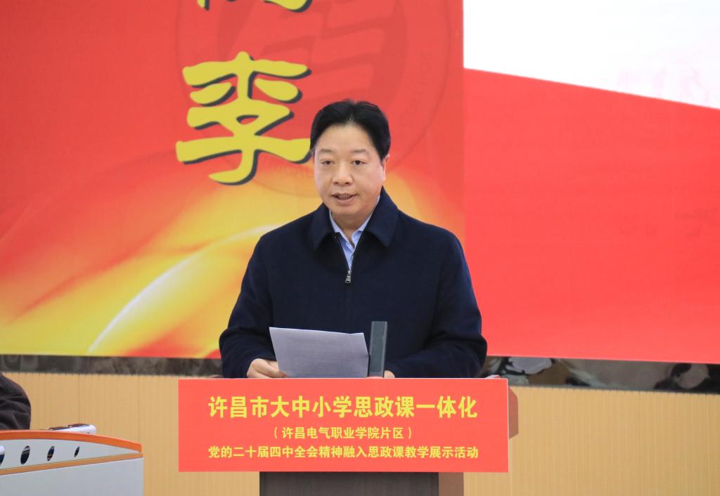 为深入学习贯彻党的二十届四中全会精神,全面落实立德树人根本任务,扎实推进大中小学思政课一体化建设,11月27日,由中共许昌市委宣传部、市委教育工委、市教育局主办,许昌电气职业学院承办的“许昌市大中小学思政课一体化(许昌电气职业学院片区)党的二十届四中全会精神融入思政课教学展示活动”在我校成功举办。许昌市委常委、宣传部部长赵鹏,许昌电气职业学院党委副书记、院长高远浩,许昌市教育局党组书记、局长刘庆等领导出席活动。各共建单位负责同志、兄弟院校马克思主义学院院长以及来自全市各学段的思政课教师和学生代表共同参与。