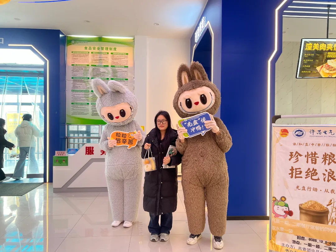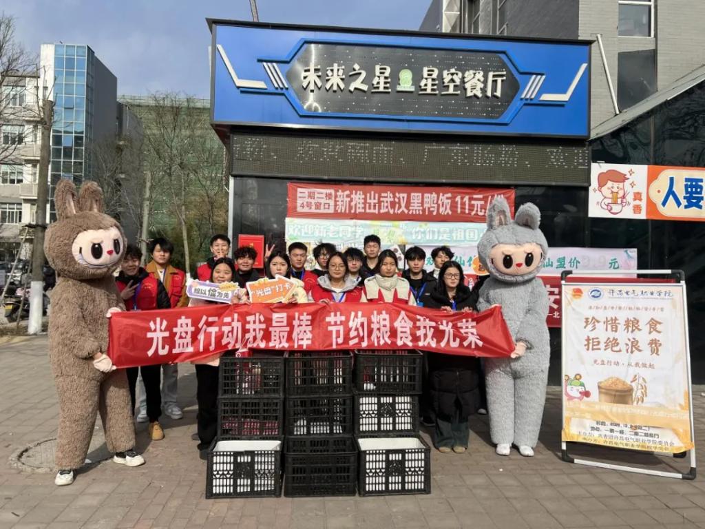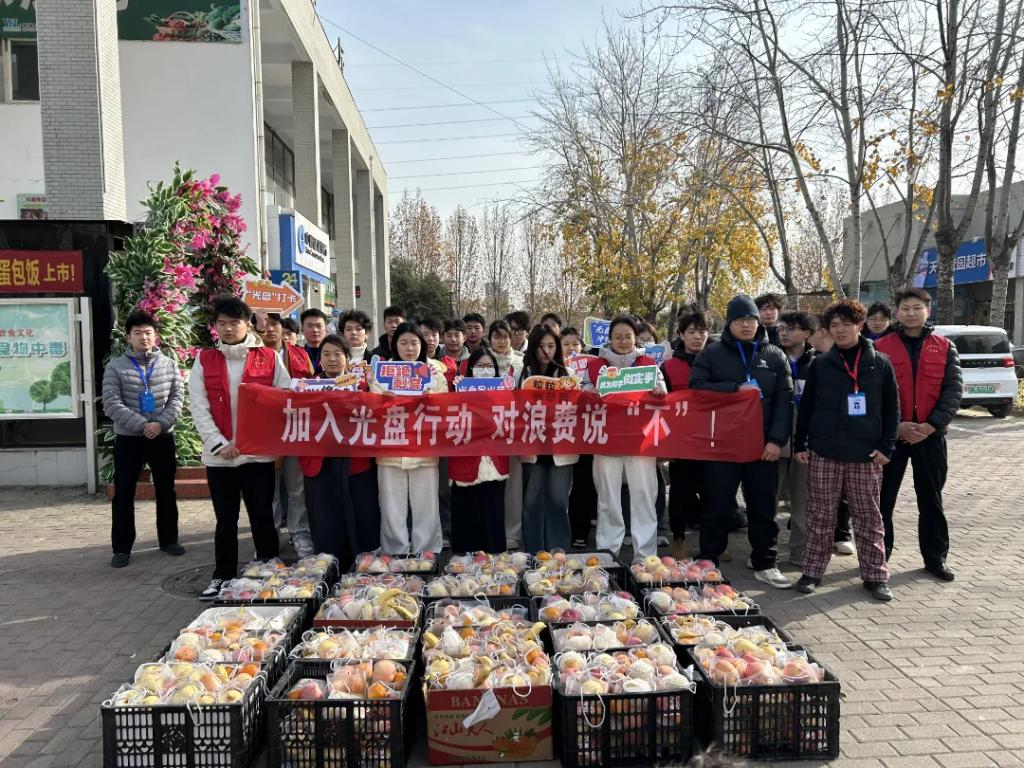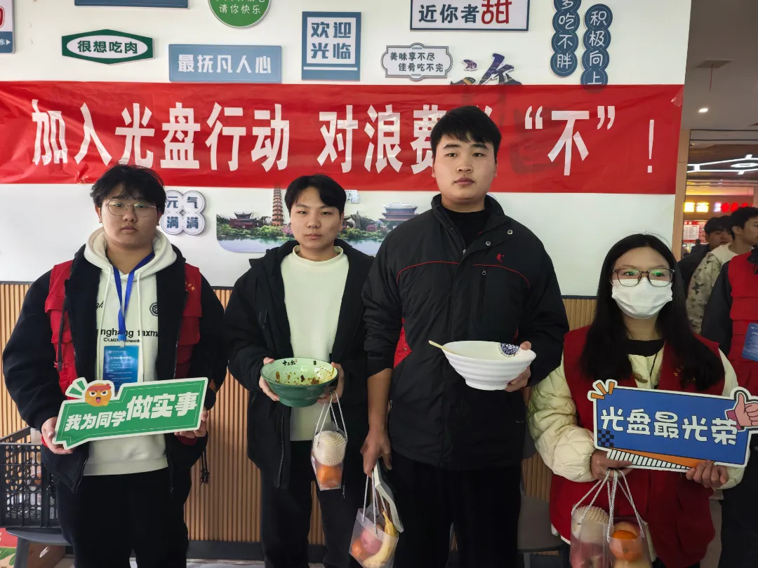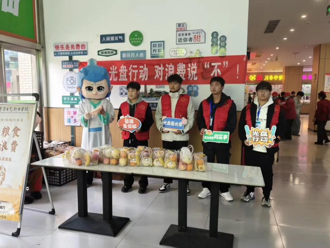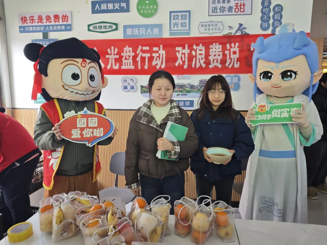 为响应国家节约粮食的号召,校学生会于12月2日午餐时段,在一期一楼鑫荣餐厅和二期二楼星空餐厅成功举办了以“光盘行动,拒绝‘剩’宴”为主题的活动。本次活动采用“光盘兑换水果”与卡通人偶互动合影相结合的方式,吸引了大批同学,在校园内掀起了一股勤俭节约的新风尚。