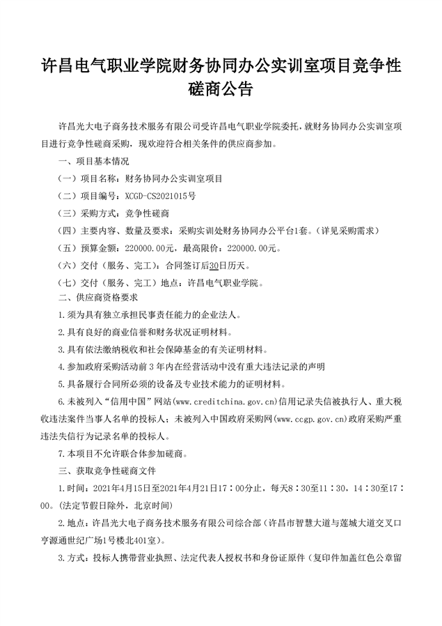 许昌电气职业学院财务协同办公实训室项目竞争性磋商公告