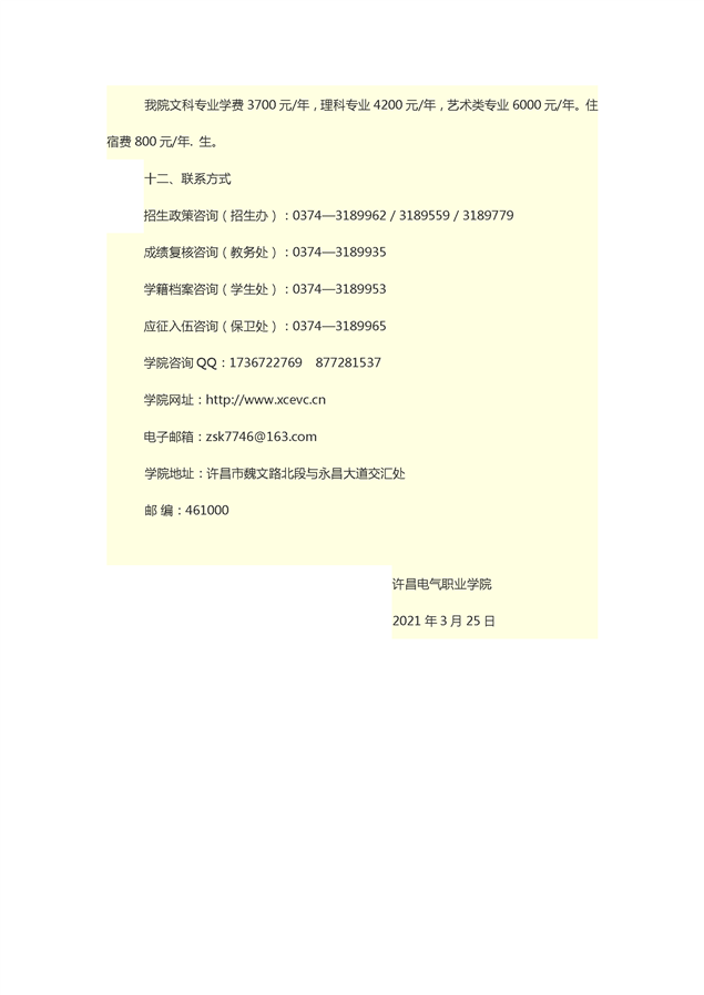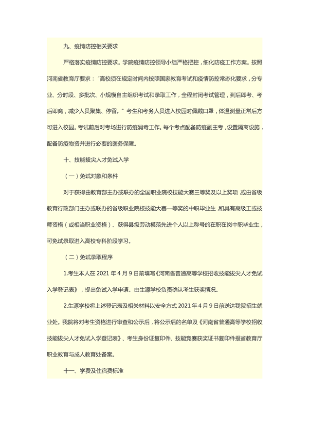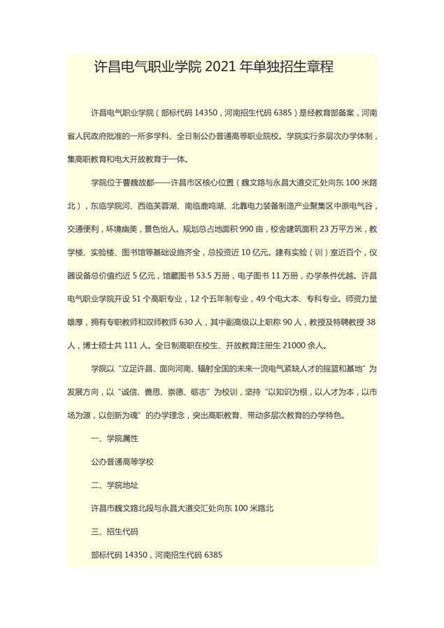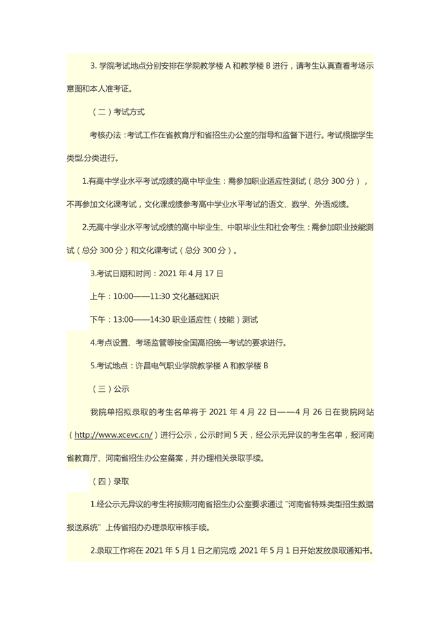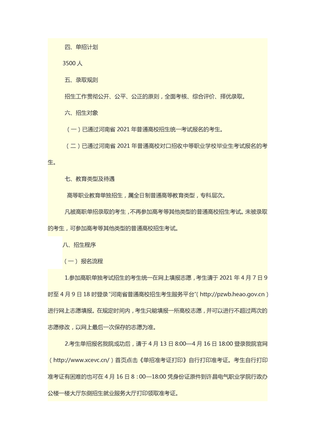 许昌电气职业学院2021年单独招生章程