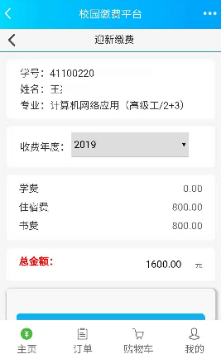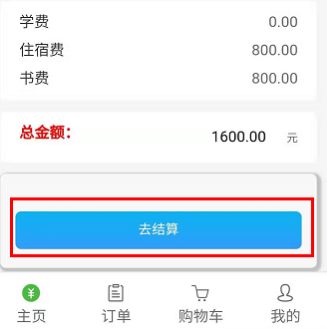 进入此页面请务必核对自己身份证号、姓名、专业及下方学费、住宿费、书费金额信息,无误后点页面下方‘去结算’即可跳转到微信支付宝缴费页面,进行缴费。