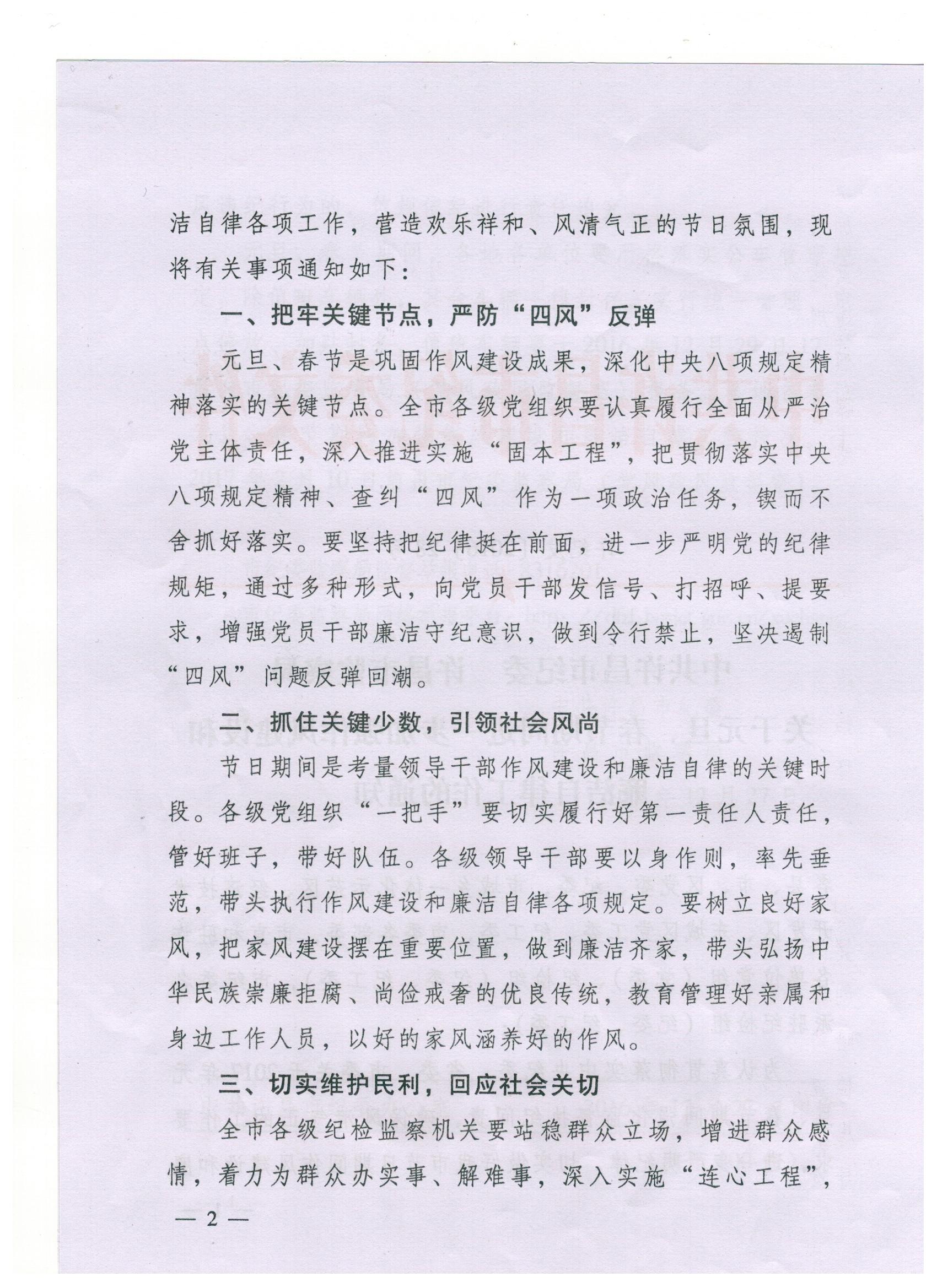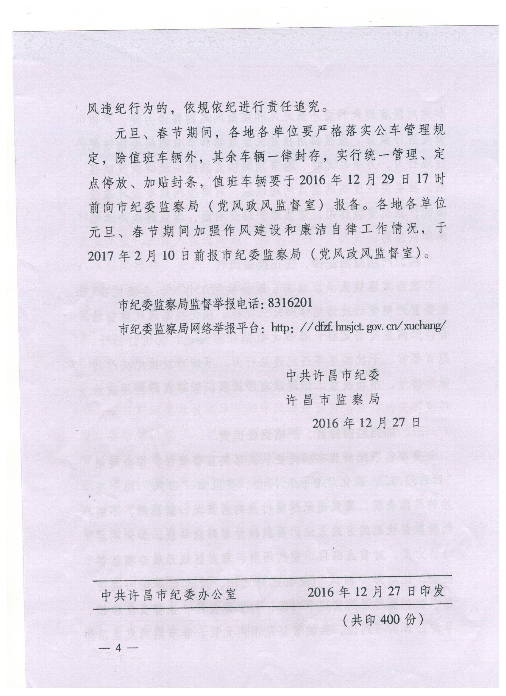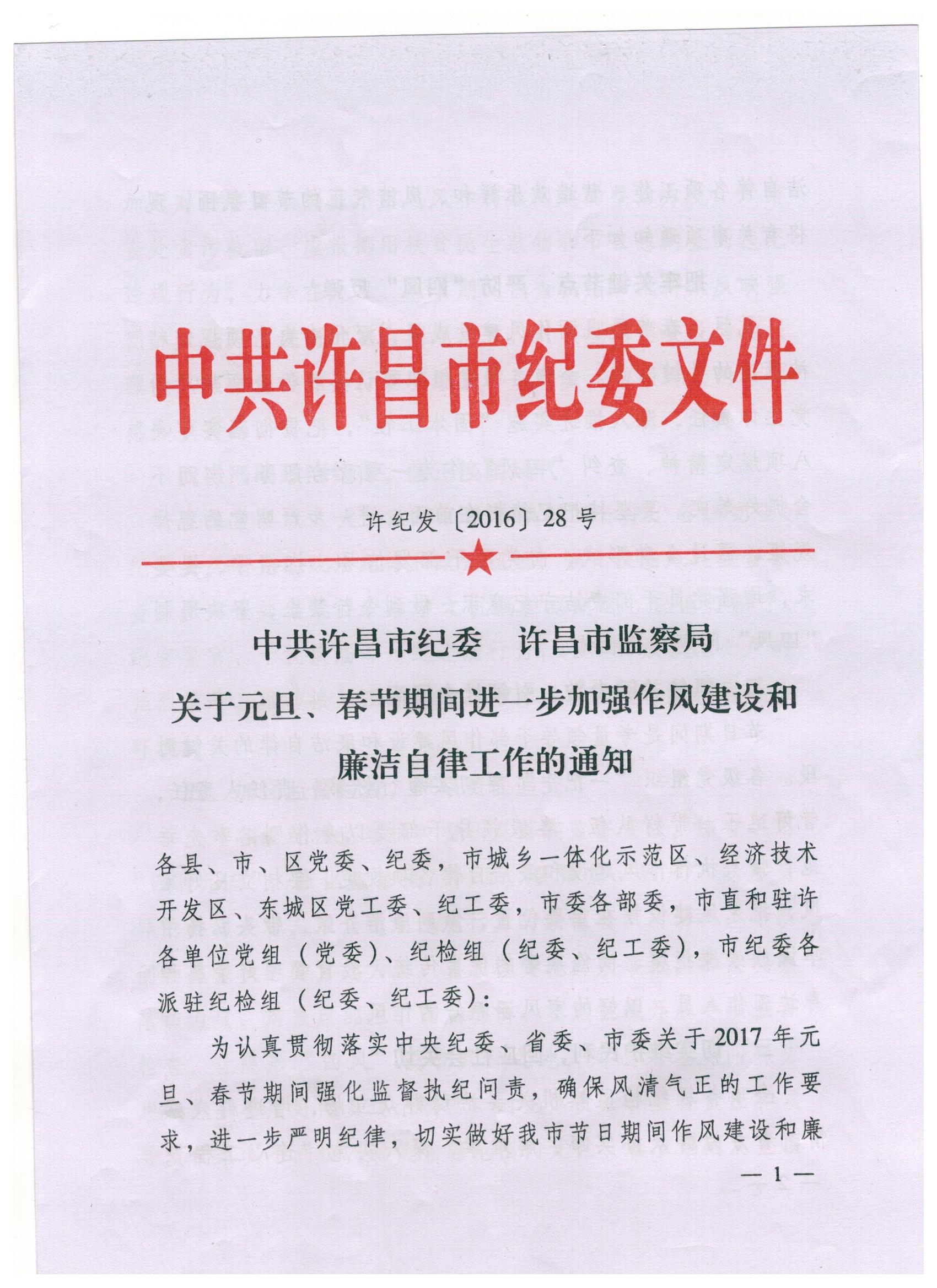 元旦、春节将至,为严格执行中央八项规定精神,切实做好我院节日期间作风建设和廉洁自律各项工作,坚决防止“四风”反弹,确保元旦、春节期间欢乐祥和、风清气正的氛围,现将许昌市纪委、许昌市监察局《关于元旦、春节期间进一步加强作风建设和廉洁自律工作的通知》(许纪发〔2016〕8号)转发给你们,请认真贯彻执行。