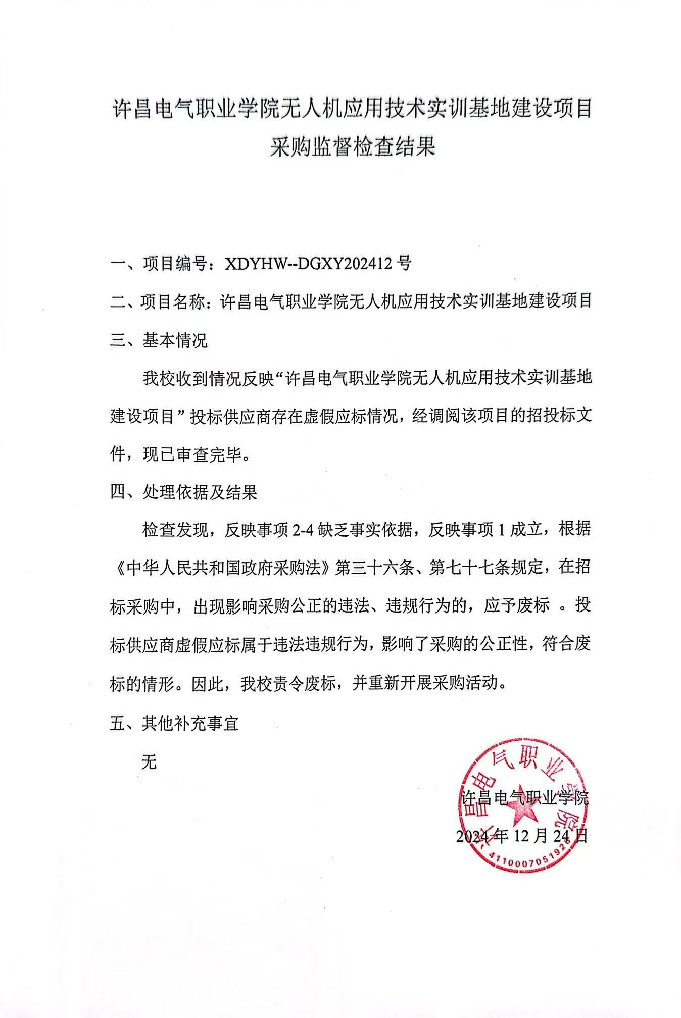 许昌电气职业学院无人机应用技术实训基地建设项目采购监督检查结果