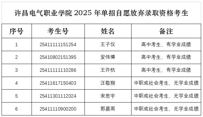 根据《许昌电气职业学院2025年单独招生工作实施方案》相关规定及工作流程,经考生本人申请、招生就业处审核,现对截至2025年4月27日18时自愿放弃录取资格的6名考生信息予以公示,名单如下: