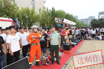 许昌电气职业学院一直把消防安全作为学校的大事来抓,时刻绷紧消防安全这根弦,定期组织开展各种消防安全检查和培训工作。近日,借助学生军训的时机,该校邀请市消防支队防火处的消防官兵来到学校,为该校2016级新生举行了一场消防知识培训。活动中,该校参训新生听取了消防知识讲座,并近距离观看了各类消防器材的使用。通过学习和演练,大家不但真切地感受到生命的可贵,还加强了自身的防火意识,掌握了基本的消防安全防范技能和自我保护能力。