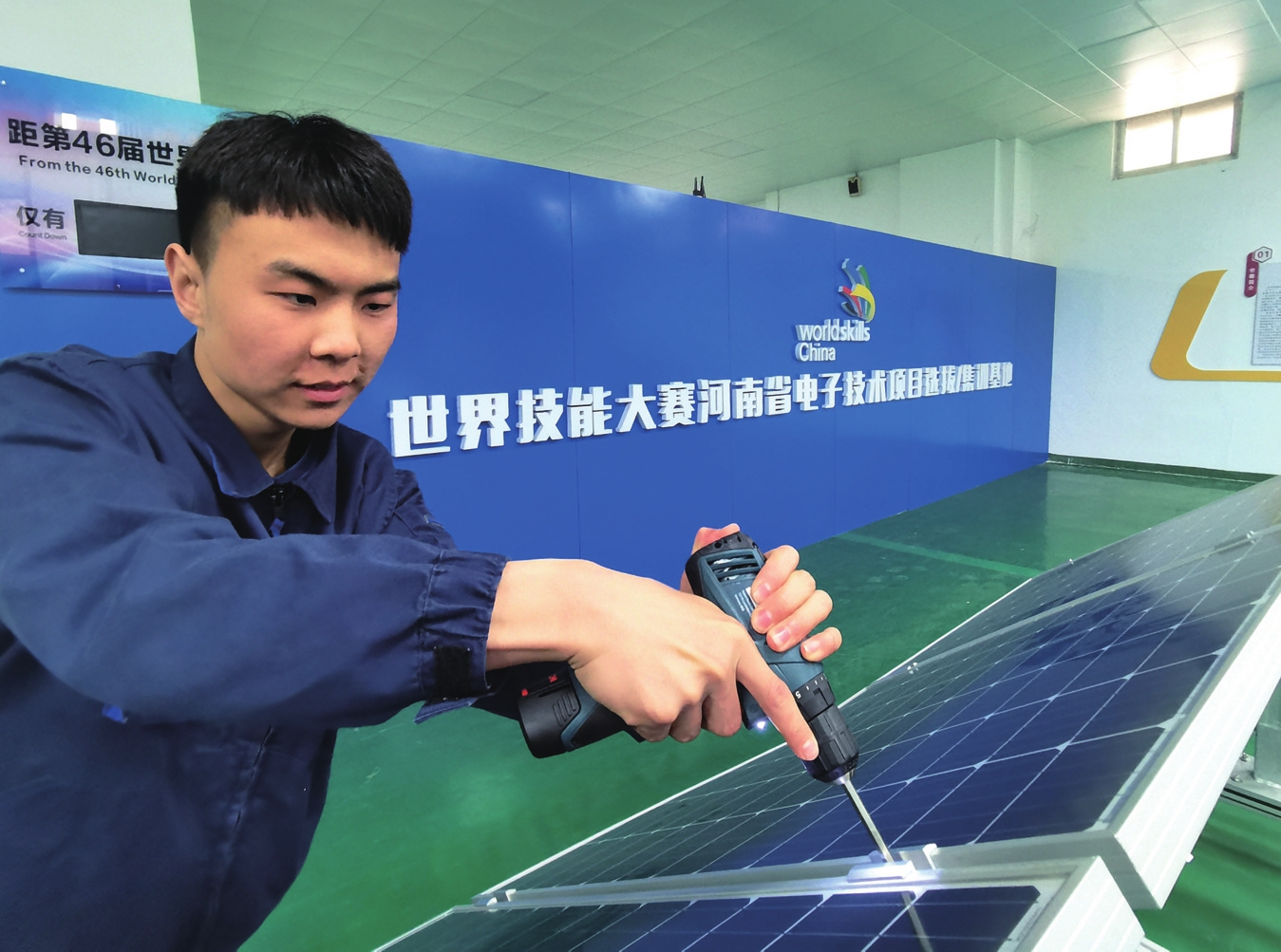 当日下午,设立在许昌电气职业学院的第46届世界技能大赛河南省电子技术项目选拔/训练基地内,汪一帆正在进行实操训练。他站在一块太阳能光伏板前,右手拿着电动螺丝刀,左手辅助,小心地固定一枚螺丝钉。周围的环境并不安静,很多同学也正在进行训练,可在他的眼中,此时的世界只有面前的光伏板和手中的电动螺丝刀。他动作精准快速,不到一分钟,十几颗螺丝钉已经安装完毕。