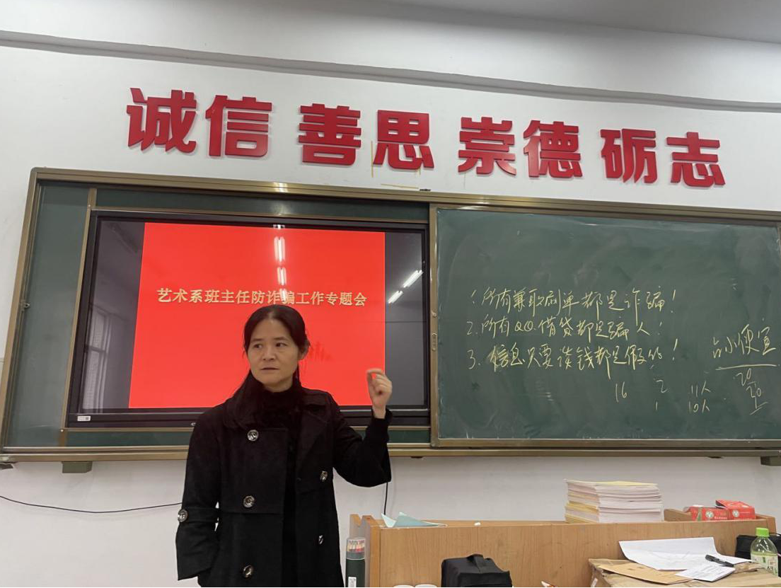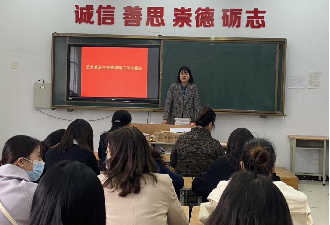 会上,艺术系负责人阎瑾瑜就如何加强大学生的安全教育向系部全体辅导员做了指导,并带领大家学习了关于防范电信诈骗的相关教育知识。同时,阎主任强调,要重视学生的心理健康教育,引导学生树立正确的价值观,提高学生的心理承受能力。艺术系学生管理负责人白鸽就开展防范诈骗教育活动做了以下安排:各班级开展防范网络诈骗主题班会,通过板报及辅导员与学生的主题讨论,让学生深刻领会网络诈骗的危害,并提高自身防范意识;各辅导员拟定致学生家长的防范网络诈骗公开信,向家长普及此项活动的宣传教育,做到家校共同教育。