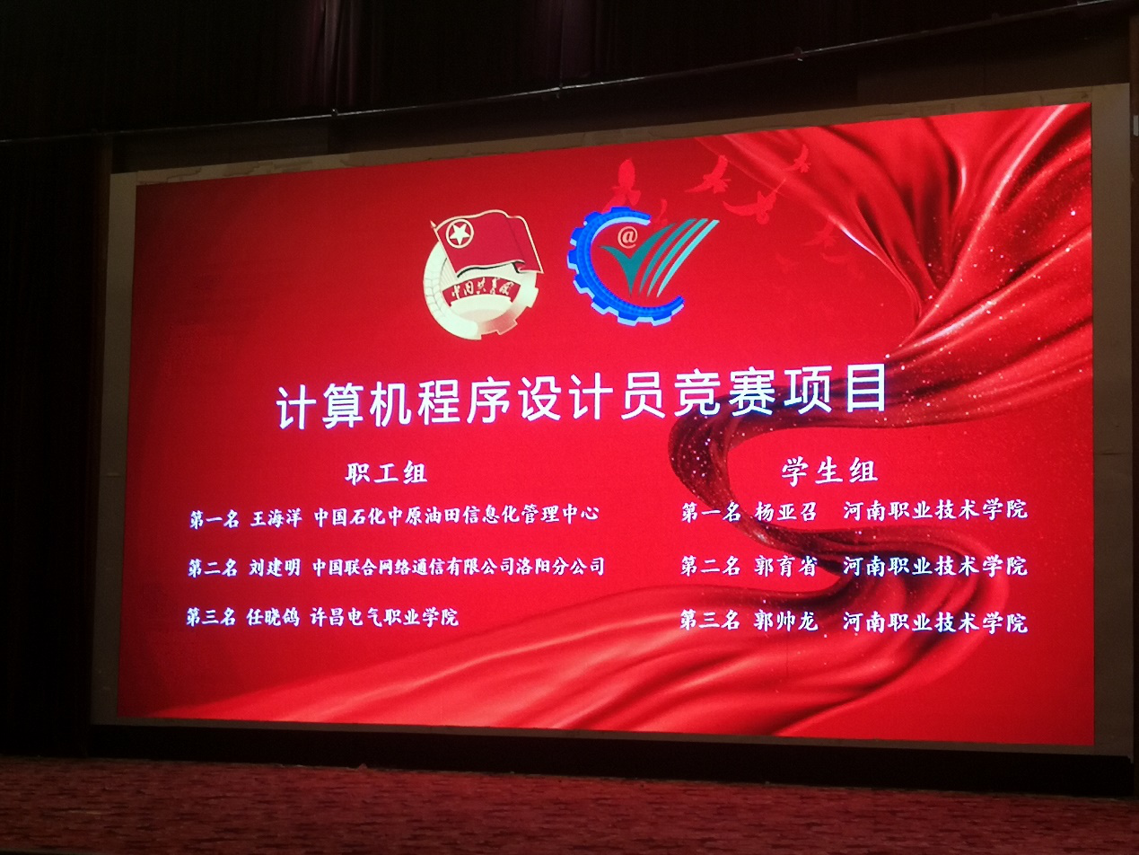 2019年9月26日至29日, 以“青春心向党 建功新时代”为主题的2019年中国技能大赛——第十五届“振兴杯”全国青年职业技能大赛河南省选拔赛暨“创出彩”2019年河南省青年职业技能大赛在漯河市成功举办。来自全省的参赛选手、大赛裁判长、裁判员等200余人参加大赛。我院信息工程系教师任晓鸽在计算机程序设计员赛项中获得河南省第三名,荣获“河南技术能手”称号,并代表河南省参加国赛决赛。