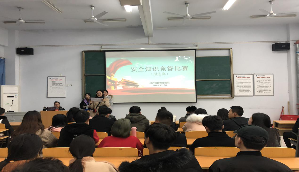 11月23日,我系为迎接学院安全知识问答竞赛,在教学楼A510教室组织了“守护生命携手共建平安校园”预选赛,通过激烈角逐选拔处四名学生组建经管系代表队参加学院问答竞赛。通过本次安全知识问答预选赛提高了学生的应急救护能力和安全防范意识,杜绝宿舍安全隐患,保障学生生命财产安全,维护正常的学习和生活秩序。