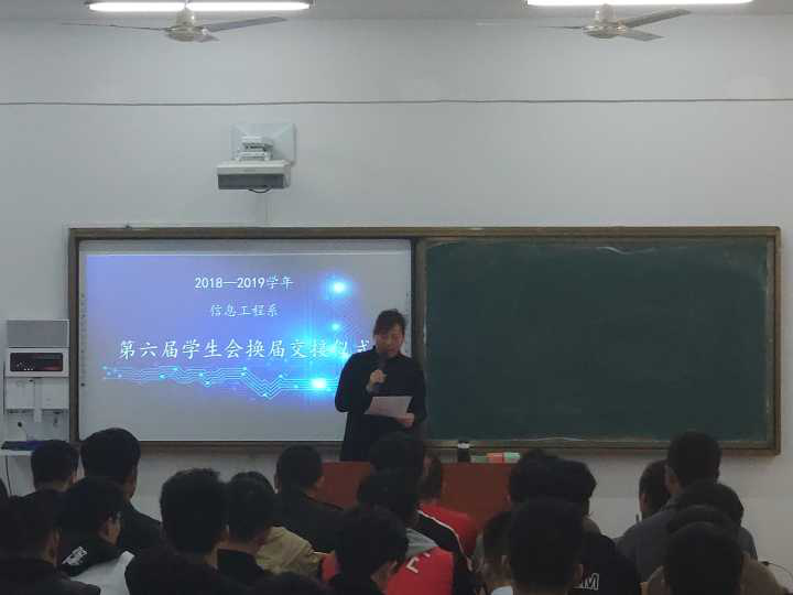 2019年3月26日下午四点半,信息工程系在教学楼B213举行了系第六届学生会干部换届大会。信息工程系新老主席团和学生会全体成员悉数到场,系领导陈晓红主任和系学生科全体老师,以及兄弟院系学生会主席等参加此次换届大会。