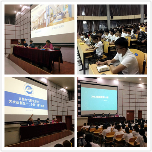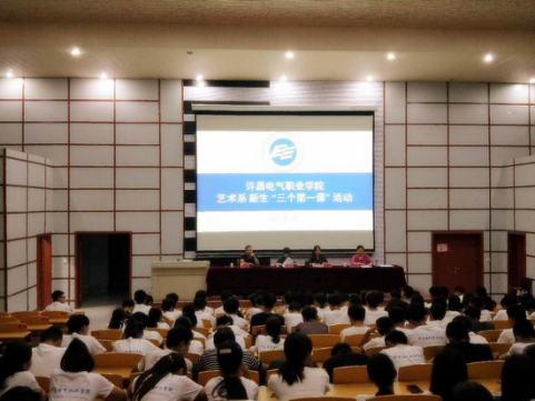 金秋送爽,丹桂飘香,在这充满收获的季节,许昌电气职业学院艺术系迎来了新一届的莘莘学子。在学院党委的精神指引下,我系于2017年9月15日在一期教学楼圆弧阶梯教室举行了2017级新生“三个第一课”活动。出席大会的有学院领导商淑敏、人事处处长张杰伟、艺术系负责人阎瑾瑜和董淑红、艺术系2017级全体新生、班主任及艺术系全体教师。