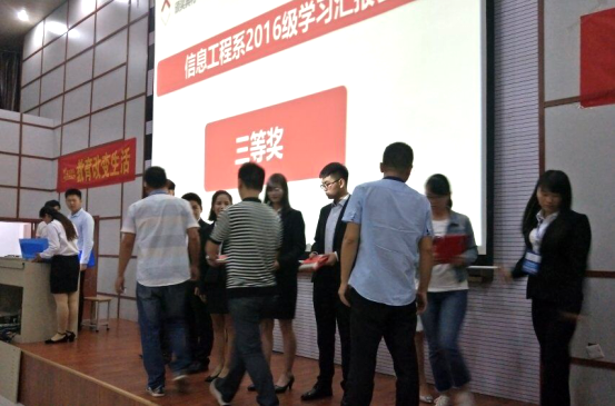 2017年9月18日晚上6点,许昌电气职业学院信息工程系北大青鸟2016级学习汇报在学院阶梯教室举行,信息工程系师生齐聚于此。本次学习汇报由学生于晨晨、蒋昊主持。出席本次学习汇报的有:许昌电气职业学院工会主席张勇,信息工程系主任陈晓红,北大青鸟专业负责人刘爱君、信息工程系教师代表王旭、任甜甜、徐俊、薛小瑞、李晓伟,以及信息工程系17级全体高职新生。