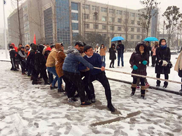 在活动开始之初,由信息工程系北大青鸟特色专业辅导员刘洁老师对此次活动做了简短的讲话。对于此次活动的目的和活动的流程做了简要的介绍,最后勉励同学们要以此次活动为契机,培养自己的团队合作精神,增强与同学之间的交流,锻炼自己,为之后大学的生活乃至将来的工作生活奠定良好的基础。不负众望,雪还未停,带给了我们不一样的欢乐。在老师的带领下,我们信息工程系的同学们首先进行了一场激烈的拔河比赛,参赛分为青鸟班和普通班。雪上拔河别有一番风趣,口号声、呼喊声、响彻整个校园!
