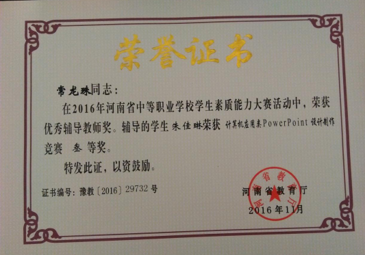 经过90分钟的角逐,我院信息工程系代表学生在百余名学生代表中脱颖而出,朱佳琳同学(带队老师:郭赟,指导教师:常龙珠)在“计算机应用类PowerPoint设计制作”中荣获三等奖,指导教师常龙珠荣获优秀辅导老师。