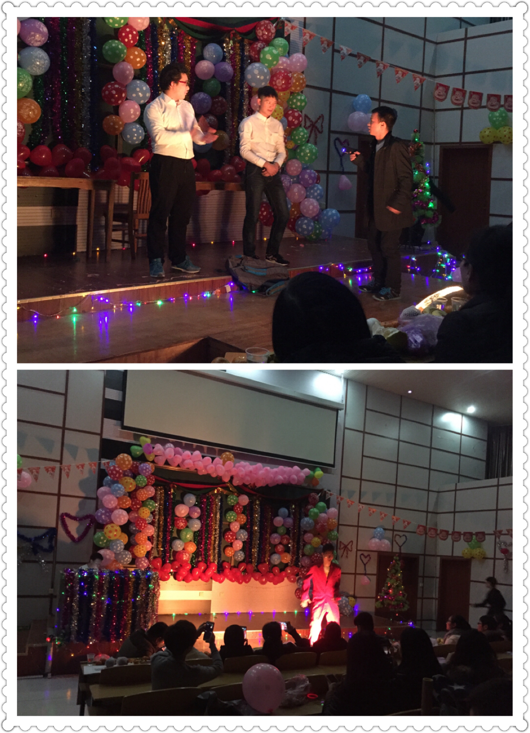 在活动开始的前几个小时,信息工程系北大青鸟大家庭的所有成员积极踊跃对现场进行着精心的布置,使现场充满浓郁的圣诞氛围和温馨浪漫的感觉,活动的开始是由北大青鸟大家庭的班委们的跳的“咋了爸爸”拉开的序幕,紧接着就是曾经风靡全球,低调奢华的“小苹果”!大家都随着节奏感,打着拍子,欣赏着那活力四射的舞姿,感受着广场舞的风情,特别是那小品演员,一上场就赢得了最热烈的掌声,除此之外,还有两个女生的喊麦,表演者们带来的独舞,独唱,和群舞。活动的进行过程中更是跌宕起伏,歌曲动感舞蹈等等。中间还穿插着主持人搞笑的对白,将现场的氛围推向高潮。此外在场观看晚会的时候主办方还派礼仪小组发送小礼品、各种糖果给大家,来传达圣诞节的祝福。在晚会的最后一首诗朗诵,为晚会拉下了帷幕,晚会结束后大家纷纷拍照留念,事后对会场进行了卫生清理。