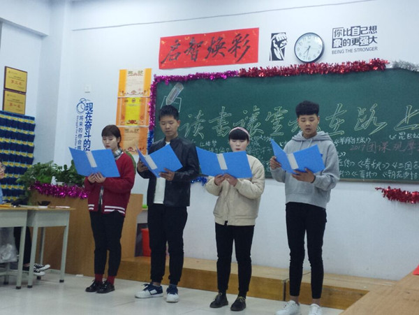 本次团会以两位同学分享的读书心得和读书体会为启幕。分别对同学们分享了自己对于图书的热爱及对读书时的真实感受,引起了大家的共鸣。接下来的小游戏环节“名著接龙”同学们踊跃参加,一度把晚会的气氛推向高潮。在同学们兴奋之余,由四位同学演讲的诗朗诵《我读书,我成长,我快乐》使在场的所有同学都置身于畅游书海的欢乐之中,再次让团会推向高潮。